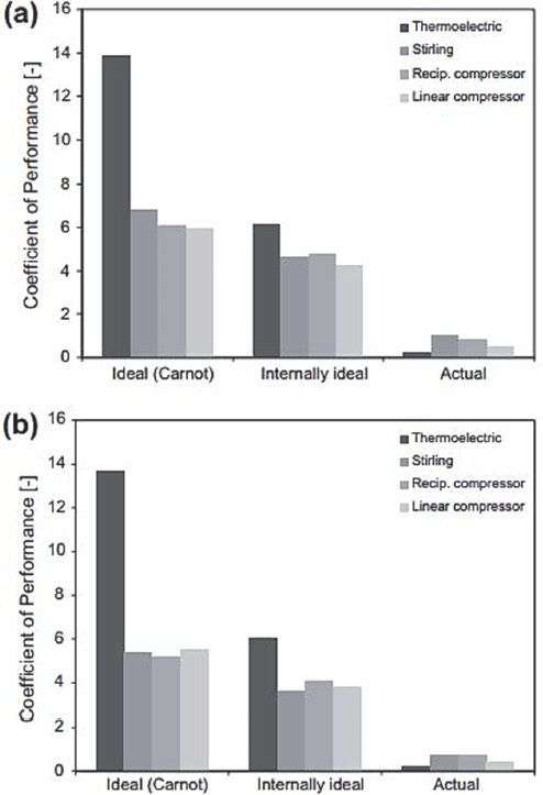 In addition, we should note that the ideal CR of the thermoelectric cooler was approximately double than that of the other systems because it generates the smallest temperature difference between the hot and cold surroundings.