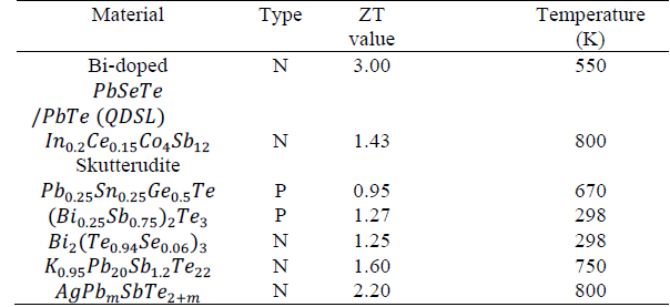 In Table 1 different materials with high ZT values can be observed. Currently, the best thermoelectric materials have ZT values around 1.0 [11].