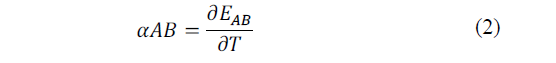 The relation between the item, EAB, and the temperature difference between the joints ΔT, defines the Seebeck coefficient in eq. (2)-(3).