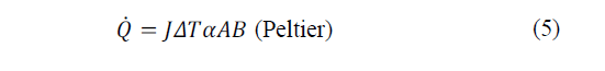 Where: πAB is the Peltier coefficient, which is defined as the heat exchanged in the junction per unit of time and current flowing through it, J is the electric current flow, ΔT the absolute temperature difference between AB and αAB the Seebeck coefficient.