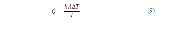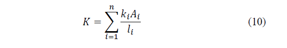 Where: k i is the coefficient of thermal conductivity of each element per unit length through section unit, A is the section normal to the direction of flow, l the length of each element and ΔT the temperature difference in the ends of the element, n is the number of elements that make up the cell [24].
