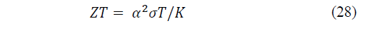 The thermal energy efficiency of a thermoelectric device can be related to the so-called dimensional figure of merit ZT, which is directly proportional to the electrical conductivity and the Seebeck coefficient of the materials in the thermoelectric pair and inversely proportional to the thermal conductivity [2]. It is given by the eq. (28):