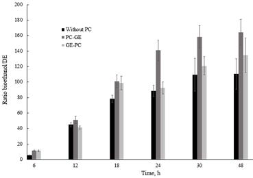 The levels of the reducing sugars were detectable after the gelatinization stage and during the SSF process. They accumulated progressively but decreased after 6.0 h until 30 h. At this point, they reached a basal level (~20 g l-1) that was maintained over the next 48 h. The maximum amount of reducing sugars was 119.25, 114.62 and 104.8 g l-1 for PC→GE, GE→PC and the reference (without PC), respectively (Fig. 3).