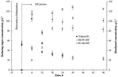 Although reducing sugars and the bioethanol concentration obtained from potato starch were similar to those attained from traditional enzymatic fermentation [9], the effect of photocatalytic pretreatment could be related to the shortening of SSF time, which was established at approximately 30 h of treatment.