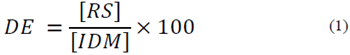 All of the resulting mash after PC pretreatment, without separation of TiO2 [29], was stabilized at 60°C and pH 5.8 [32] and mixed with 10.0 ml l-1 Liquozyme SC (5.6 KNU g l-1). The mixture, containing approximately 51.0 g l-1 total solids, was liquefied at 83°C for 2.0 h. The enzyme activity was inactivated by adjusting the pH (~4.3) with 1.0 M HCl. Aliquots of the supernatant were separated by centrifugation (8000 rpm for 5 min) and used to determine reducing sugar content using a DNS method, relative to a glucose standard curve. The dextrose equivalent (DE) value for the treatments was calculated as the amount of reducing sugars (g) expressed as a percentage of the initial dry matter (g) according to the following equation (eq. 1):