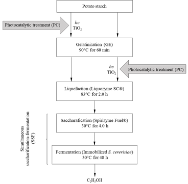 Whereas photocatalytic (PC) pretreatment has been used to transform organic waste [25-28] and complex structures such as lignocellulose [29], its application for modifying starchy materials used for bioethanol production by OH• radicals participation, has rarely been reported. In this work, the effect of PC treatment, with TiO2 before and after the gelatinization (GE) process during SSF, on bioethanol production from potato starch was tested (Fig. 1).