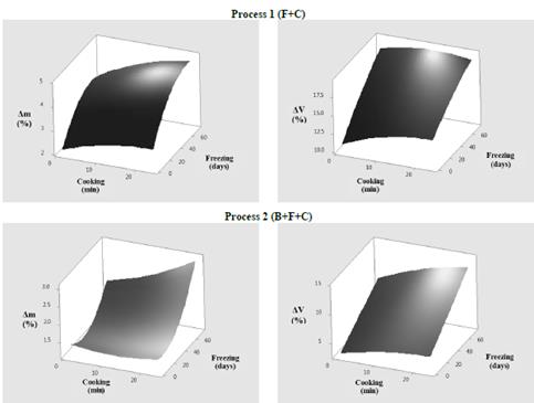 Regarding ΔV, a volume decrease was observed in OFSP samples for all processes evaluated at higher freezing times. Maximum values of ΔV were obtained, independently of cooking time, in freezing times in excess of 72 days, in frozen-and-cooked samples with a volume variation of 21%, while blanched-frozen-and-cooked samples presented 13% volume variation. This behavior in the volume decrease is associated with the increase in drip loss during freezing, due to the ice recrystallization process. According to [6], drip losses in food produce damage to the structure, causing shrinkage and microstructural changes.