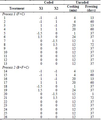The effect of the cooking time and freezing storage time on the quality of fresh, only cooked, blanched, and unblanched OFSP was studied using Response Surface Methodology (RSM). A central composite rotatable design was used for cooking time, which ranged between 1 and 24 min, and with freezing storage time ranging between 1 and 72 days, as independent variables. The design required 13 variable combinations that were performed in random order, including five replicates of the center region to generate a quadratic response surface (Table 1). In both processes, each treatment combination was repeated twice, and all results were averaged. Range finding experiments were performed at the outset of this study, in order to ascertain what cooking temperature and time ranges could be applied to the OFSP, such that the product would be acceptable to consumers.