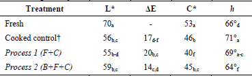 Chroma is a measure of the saturation, vividness, or intensity of color, and is completely separate from hue and lightness. For the control treatment, C* decreased after 15 min of cooking from 53 to 46. This decrease in chroma indicates a loss in color intensity in OFSP samples, denoting a less saturated, duller color after cooking, which might be an indicator of browning. Similar behavior was observed in tomato, as consequence of the carotenoids pigments degradation, caused by exposure to high temperatures, light, oxygen, and pH changes [3]. A minor decrease of C* in Process 2 (B+F+C) was also observed, which indicates a saturated color in OFSP samples. On the contrary, in Process 1 (F+C), the chroma presented a greater decrease than the control treatment. Similarly, samples that were blanched prior to freezing showed an increase in chroma, as compared to samples without pretreatment. This result emphasizes the potential that a preliminary blanching can have for the freezing and cooking processes to increase color purity. The beneficial effect of blanching as pretreatment, on the chroma differences, was similar to that observed in freeze-dried pumpkin [12].