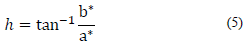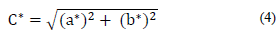 The color indicators, relative total color difference ΔE, chroma C*, and hue angle h were calculated with the use of eq. (3)-(5) [19].