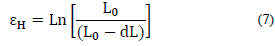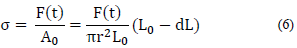 Where σ is the stress, εH is the Hencky strain, F(t) is the momentary force, A0 is the initial cross-sectional area, r is the radius of the sample, L0 is the height of the unstrained sample, and dL is the deformation rate.