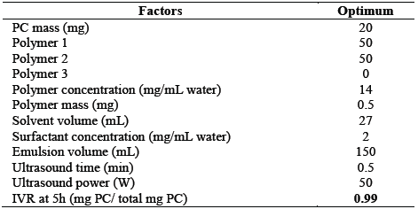 Where, x 1 is the quantity of PC (mg); x 2, x 3 and x 4 is the relationship between encapsulating polymers, x 5 is the concentration of the polymer (mg/mL water), x 6 is the quantity of the polymer (mg); x 7 is the volume of solvent (mL); x 8 is the surfactant concentration (mg/mL water); x 9 emulsion volume (mL); x 10 is the ultrasound time (min), and x 11 is ultrasound power (W).