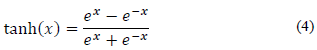 The activation function computes the activity status of a neuron by calculating the global input at an activation value [30]. The most common functions are the sigmoidal logistic function, Eq. (3), and the hyperbolic tangent function, Eq. (4).