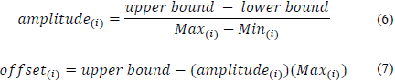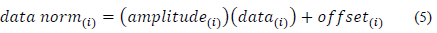 Where data norm (i) refers to the standardized data for each i variable, data (i) is the data entered by the user for each i, and amplitude (i) and offset(i) (compensation) are coefficients calculated for each i by eqs. 6, 7.
