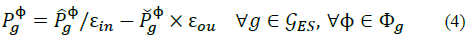 are the power being injected and withdrawn from the network; εin and εou are the efficiencies when injecting and withdrawing such power; and,
