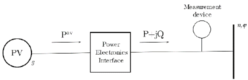 Figure 1: Power injection by a PV system g at phase φ of node n. If solar energy is curtailed, P<P