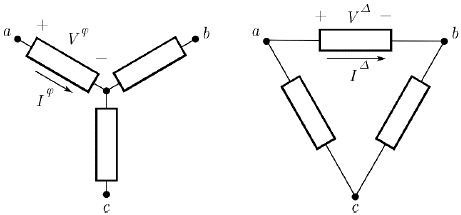 Figure 3: Wye (left) and delta (right) load connections. Branch voltage for the wye load is equal to the phase-to-neutral voltage, while for the delta load is equal to the phase-to-phase voltage.