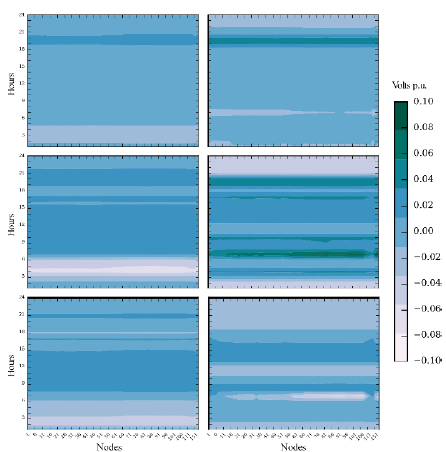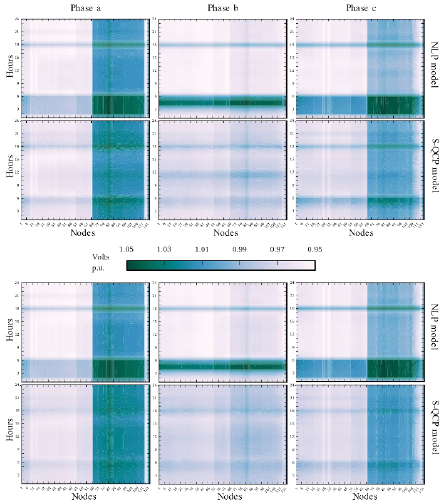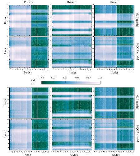 Also note that voltage differences of Fig. 9 are lacking vertical lighter or darker areas. This means that voltage differences between nodes for the NLP and the S-QCP models are very similar. Voltage differences are then more sensitive to changes between time periods, because of the differences between the active/reactive power needed to maintain the optimal voltage magnitude.