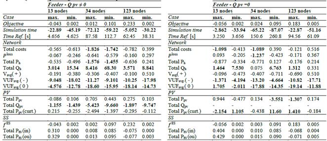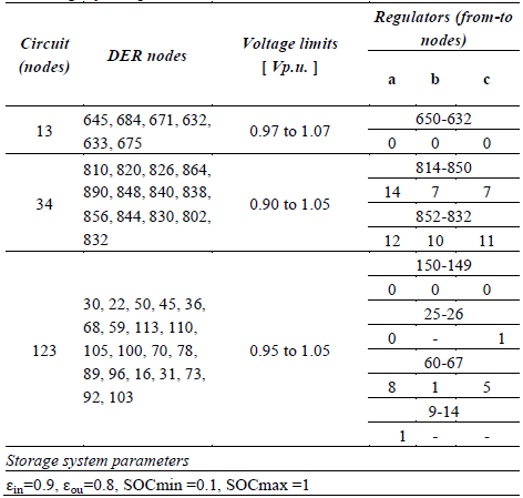 Table 1 describes the nodes where PV and ES systems are connected (DER nodes). Also, there are described the maximum and minimum voltage magnitude values for each circuit, along with the regulator tap settings and the ES parameters.