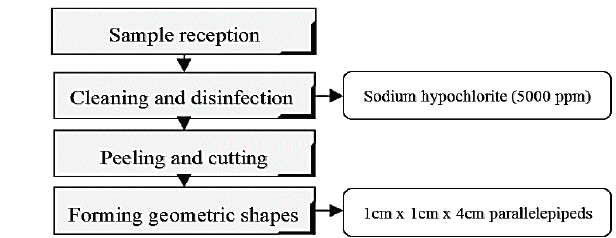 Hypertonic solutions were prepared prior to dehydration process. The first solution consisted of a mixture of stevia, salt and water (S1) while the second solution consisted of glucose, salt, and water (S2), at the following concentrations: 20% w/w (15% sweetener - 5% salt), 30% w/w (25% sweetener- 5% salt) and 40% w/w (35% sweetener - 5% salt). The sample-solution ratio was 1:20 w/w, 40-160-min processing times, 40-min intervals. Constant stirring speed at 100 rpm was used. Subsequently the samples were removed and drained on absorbent paper for 1 min, and then packed and deposited into a desiccator. Then, weighting and moisture analysis were carried out according to Colombian Institute for Technical Standards and Certification (ICONTEC) standard NTC 572.