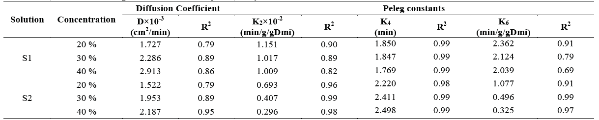 Table 1: Diffusion coefficients and Peleg constants obtained experimentally