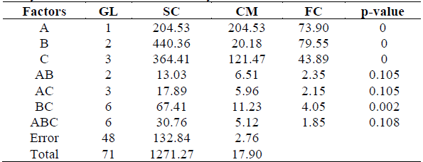 Regarding 2-way interactions a p-value less than the level of significance was obtained for the BC (concentration-time) interaction only, which indicates that there is sufficient statistical evidence to affirm that this interaction is quite significant. Therefore, significant differences were detected for the mean values of the moisture content in osmotically dehydrated pumpkin due to interaction between concentration and time. Based on this result, polynomial adjustment was carried out for the remaining combinations as shown in Table 3.