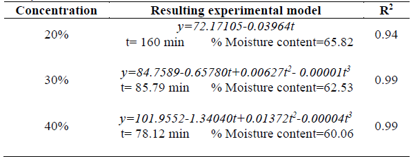 With regard to time-concentration interaction it should be mentioned that the lowest moisture content rate reported for dehydration process was 60.06 % by using a 40 % w/w concentration over a 78.12-min period. Therefore, it can be deduced that lower moisture rates can be obtained by using intermediate dehydrating times. This phenomenon can be attributed to the fact that mass exchange occurs more quickly during the first stages of the osmotic dehydration process, until equilibrium is reached [24,25]. Similar results were reported for osmotic dehydration of yacon using a sucrose-water solution, where the greatest water loss rate occurred during the first 60 minutes, and no significant changes in water content of the resulting product were observed after this period [11].