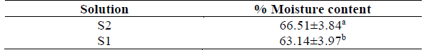 The above results suggest that the stevia-salt-water solution has the lowest moisture rate in tests with osmotically dehydrated pumpkin, which is statistically significant regarding the value reported for the glucose-salt-water solution. Therefore, it can be deduced that the latter solution performed better when it comes to osmotic dehydration of auyama samples.