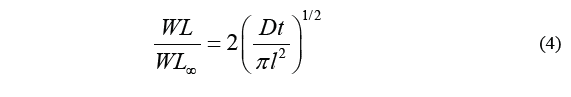 Diffusion coefficient for each treatment was calculated by the method proposed by Maldonado [11], which uses the standard Fick model to obtain the diffusion coefficient based on the square root of time. Therefore, the diffusion coefficient was determined by calculating the slope of the resulting lines, as described in the Eq. (4).