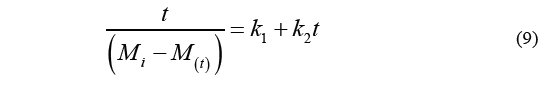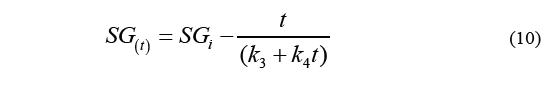 Where k 1 is the intercept in the axis of the ordinates, and k 2 is the parameter of the capacity constant. Likewise, Eq. (8) can be used to calculate solid gain, resulting in the Eq. (10).