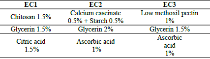 The concentrations of the coatings were selected from preliminary tests in which these proved not to affect the physical or sensory appearance of the fruits. Table 2 shows the suitable formulations for the different edible coatings.