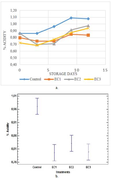 Figure 6: a) Kinetic of the acidity percentage of the EC during the days of storage. b) Behavior of the acidity percentage of EC through statistical analysis with Statgraphics.