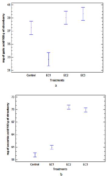 EC2 and EC3 can be attributed to a higher enzymatic activity in the biosynthesis of phenolic compounds, as reported [19], in this study on mora de Castilla, while the lowest value of total phenols was found in strawberries treated with chitosan (EC1) and this is probably because it was the treatment with the least deterioration (greater acceptability) and perhaps this is related to the effect of EC in decreasing the activity of enzyme phenylalanine ammonia lyase (PAL) and/or delaying the deterioration process and, thereby, decreasing the accumulation of said phenolic compounds due to decreased metabolic processes of the product that bring with along its senescence. Similar behaviors have been reported, which found that the effect of chitosan coating on strawberries could maintain total phenol content [13].