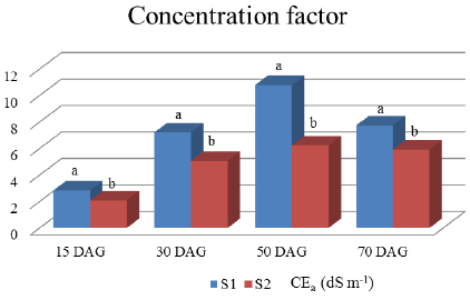 Figure 5: Concentration factor - CF at 15, 30, 50 and 70 days after germination (DAG), irrigated with two saline waters.