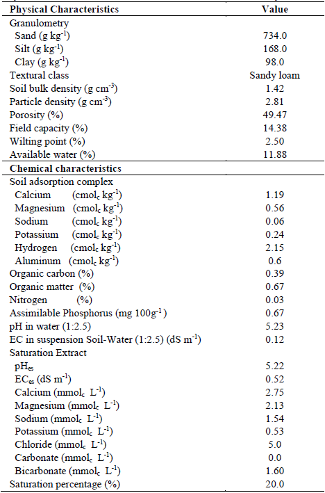 The soil was classified asEutrophic Regolithic Neosol, collected in the surface layer from 0-20 cm (horizon A). The soil was shredded, homogenized, sieved with a 5 mm mesh and afterwords dried in the air. After drying, the soil was characterized with respect to its physico-chemical properties (Table 1) in the Irrigation and Salinity Laboratory (LIS) of the Federal University of Campina Grande, PB, Campus I, following the methodologies recommended by [9] and [10].