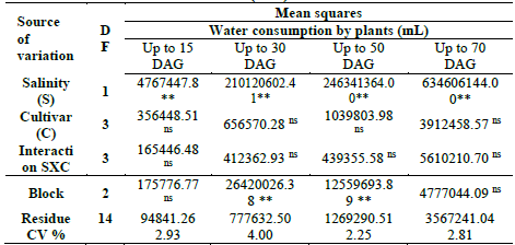Figure 1: Accumulated water consumption of the plants at 15, 30, 50 and 70 days after germination (DAG), irrigated with two saline waters.