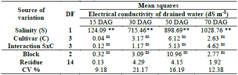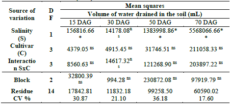 For the variable volume of water drained in the soil (Table 3), significant effects were observed (p <0.01 and <0.05) in the factor levels of irrigation water salinity, in all stages evaluated except for the 30 DAG. For the cultivar factor and the S x C interaction, there was no significant effect at any time of evaluation.