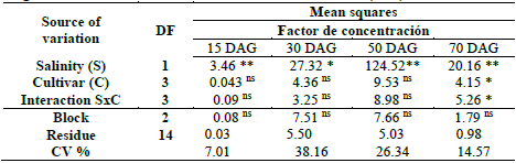 Table 6 shows a significant effect at 0.01 probability level for the factor of salinity levels of irrigation water in all periods evaluated for the concentration factor, however, for the cultivar factor no significant effects were found in any evaluation period with the exception of 70 DAG, the same occurred in the S x C interaction.