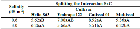 According to the data in Table 7, the splitting of the cultivar within the salinity levels studied caused a significant effect on the results, where the cultivars Catissol 01 and Multissol differed statistically from the cultivar Helio 863 using ECw of 0.6 dS m-1. In the case of the ECw water of 3.0 dS m-1, the cultivars Embrapa 122-V2000 and Helio 863 differed statistically from the cultivars Catissol 01 and Multissol.