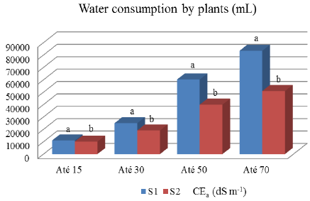 A decrease in water consumption by the plants when the non-saline S1 condition (ECw = 0.6 dS m-1) was changed to the S2 salt (ECw = 3.0 dS m-1) can be observed, reducing to 8.12, 23.69, 33.66 and 39.00% at 15, 30, 50 and 70 DAG, respectively (Fig. 1). In general, there was a tendency to reduce water consumption (mainly at the highest level), as the cycle progressed. The osmotic effect of salinity was also observed, since with the increase in ECw, there was a decrease in water consumption by the plant, harming the growth and development of the crop [12]. When studying different sunflower cultivars under conditions of salt stress, the same authors verified that the water consumption decreases with the decrease in osmotic potential of the saline solutions.