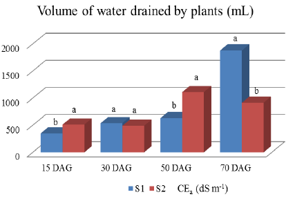 The salts accumulated in the root zone (when in excess) make it difficult to extract water from the plant. This can be observed at 70 DAG, by analyzing the volume of drained water (Fig. 2) and the LF applied, since even though the leaching fraction is higher in water S2 (Fig. 3), the drained volume was much lower (Fig. 2).