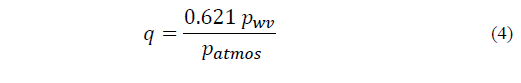 To obtain q, the absolute humidity of water vapour kg per kg of moist air, the formula, Eq. (4), is used where 0.621 (18/29) is the ratio of the effective molecular weights of water vapour and dry air, [3] p.127: