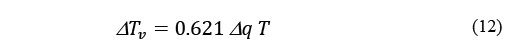 Where T v is the virtual temperature of the water vapour; T is the actual temperature of the air; and q is the specific humidity of moist air, kg water vapour per kg moist air. For the condensation of one gram of water vapour in 1 kg of air at 0 °C, the temperature reduction would be 0.17 °C.