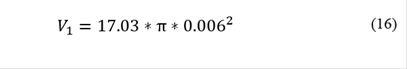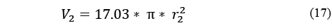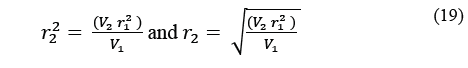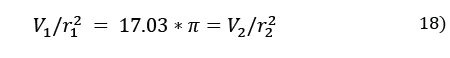 If no air passes over the cooling coils, as for instance before any cooling cycle is initiated, the volume encompassed by the cooling coils will be the total length of the copper tubes multiplied by П multiplied by the radius squared, i.e. 17.03*3.1418*0.006^2. The stand-by volume is therefore 0.00193 cubic metres. Meanwhile, the air parcel volume is derived from eq. (14)-(15). As a result, the actual radius of action around the copper tubing during any experiment can be determined. eq. (16) gives the stand-by volume and eq. (17) the volume of the air parcel during an actual experiment. Given that 17.03 and π are common to both equations, eq. (18) is obtained and then eq. (19) [5]