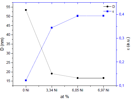 Figure 6: Crystallite size (D) for the (Zr.Ti)N phase and microdeformations (ε) depending on the nickel addition.