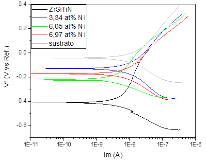 The corrosion resistance of the ZrSiTiN+Ni coatings was studied using a three-electrode system in a Gamry 600 potensiostat at room temperature. The samples were mounted in a special cell, in which the exposed area was 0.196 cm². In the corrosion resistance experiments, the substrates were used as a working electrode with a platinum one as the counter electrode, and a 3.5% NaCl solution was used as the electrolyte (pH 7.9). Before performing each experiment, the corrosion potential was allowed to stabilize for 45 minutes of immersion in the solution. In the potentiodynamic polarization conduction (PP) experiments, the initial potential was -0.3V and the scanning speed was 0.5 mV/s. The corrosion current density (Icorr) was estimated by a linear adjustment using extrapolation by Tafel in the Gamry Echem Analyst Software.