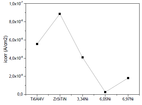 Fig. 8 shows the change in the corrosion current density of the ZrSiTiN thin films with the addition of nickel on the Ti6Al4V substrate. The thin film that has the best corrosion resistance for the lowest corrosion density is the film with 6.05 at% Ni. When the coating has 6.97 at% Ni, the corrosion resistance increases in relation to the value of the thin film with 6.05 at% Ni; this indicates that up to a certain percentage of added nickel, the coating has greater resistance to corrosion. In general, the corrosion current has lower values each time the nickel increases, and the corrosion potential varies depending on the amount of nickel in each film.
