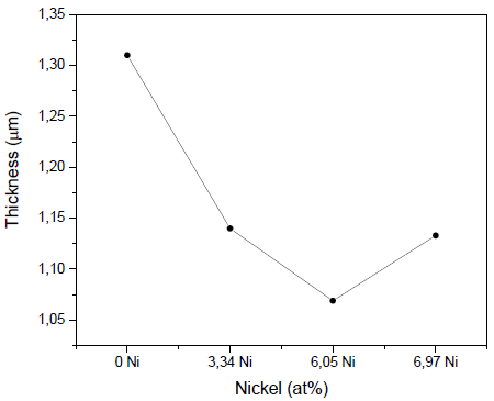 Fig. 2 shows the results for deposit rates in the produced coatings. It can be seen that the coatings deposited without nickel showed the highest values of thickness, 1.31µm ± 0.15 µm, while the addition of nickel reduced the films’ thickness, with values of 1.14 µm ± 0.13 µm (3.34 at% Ni), 1.069μm ± 0.12μm (6.05 at% Ni), and 1.133μm ± 0.13μm (6.97 at% Ni). It is possible that the nickel in the erosion zone of the Zr target produces a decrease in the polarization of the target due to the lower emission of secondary electrons; that is, the efficiency of the sputtering decreases.