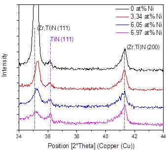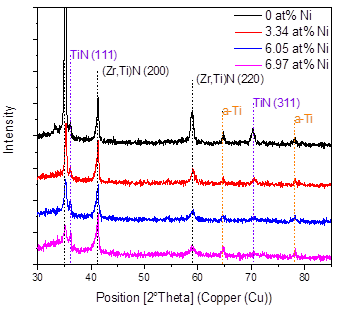 In general, the presence of the related peaks of the substrate and the signals of the FCC phase of (Zr, Ti) N in planes (111) and (200) can be seen. A decrease in intensity of the peaks can also be observed as the percentage of nickel increases; i.e., the addition of nickel favors the formation of an amorphous material. When nickel is added, the crystallite size of the coating decreases. The average crystallite size estimated by the Scherrer equation is between 53.43 nm and 16.69 nm. The results of this research also show an increase in the microdeformation of the coatings with the increase in nickel.