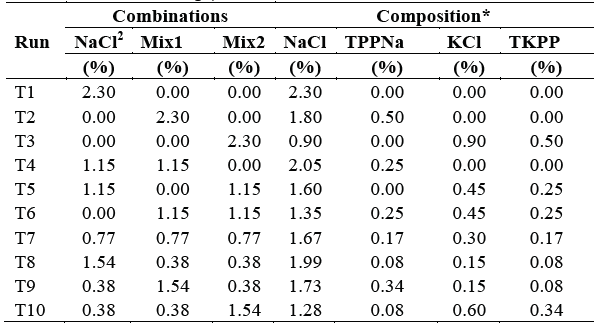 T: treatment, Mix1: mixture 1: 78% NaCl and 22% TPPNa, Mix2: mixture 2: 39% NaCl, 39% KCl and 22% TKPP, TPPNa: sodium tripolyphosphate, TKPP: tetrapotassium pyrophosphate, *Added as P2O5. Source: The Authors.